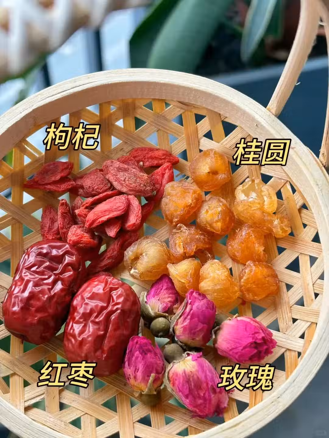 食材:玫瑰花5朵、紅棗3顆、枸杞15粒、桂圓5顆、紅糖適量、清水500毫升