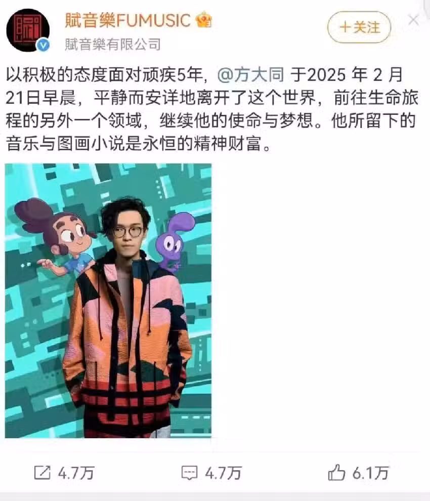 在與疾病抗爭了5年之後,方大同於21日平靜離世,享年41歲。