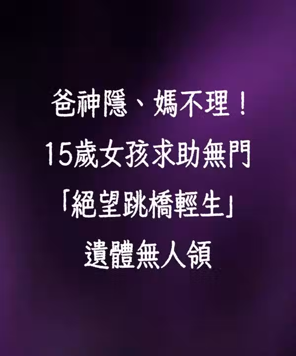 快訊/爸神隱、媽不理!15歲女求助無門「絕望跳橋輕生」 遺體無人領