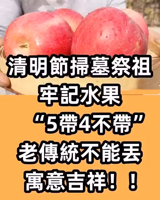 清明節掃墓祭祖,牢記水果「5帶4不帶」,老傳統不能丟,寓意吉祥!根據傳統習俗,並不是所有水果都可以用來掃墓祭祖,有「5帶4不帶」的說法,老輩人的說法就是水果帶錯了會影響家中的福氣和運氣,所以為了尊重老傳統,也為了圖個吉祥,一起來看看到底有什麼講究吧!