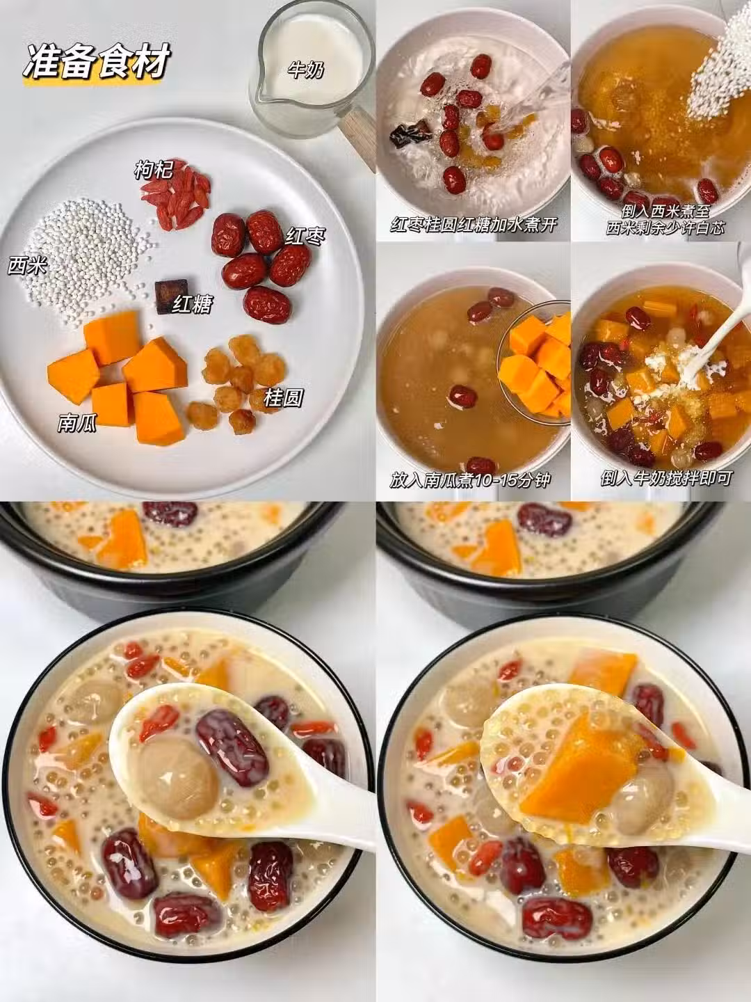 1.紅棗、桂圓洗乾淨後,和紅糖、清水一起倒進乾淨的鍋里,大火煮開後再加入西米,轉中火煮