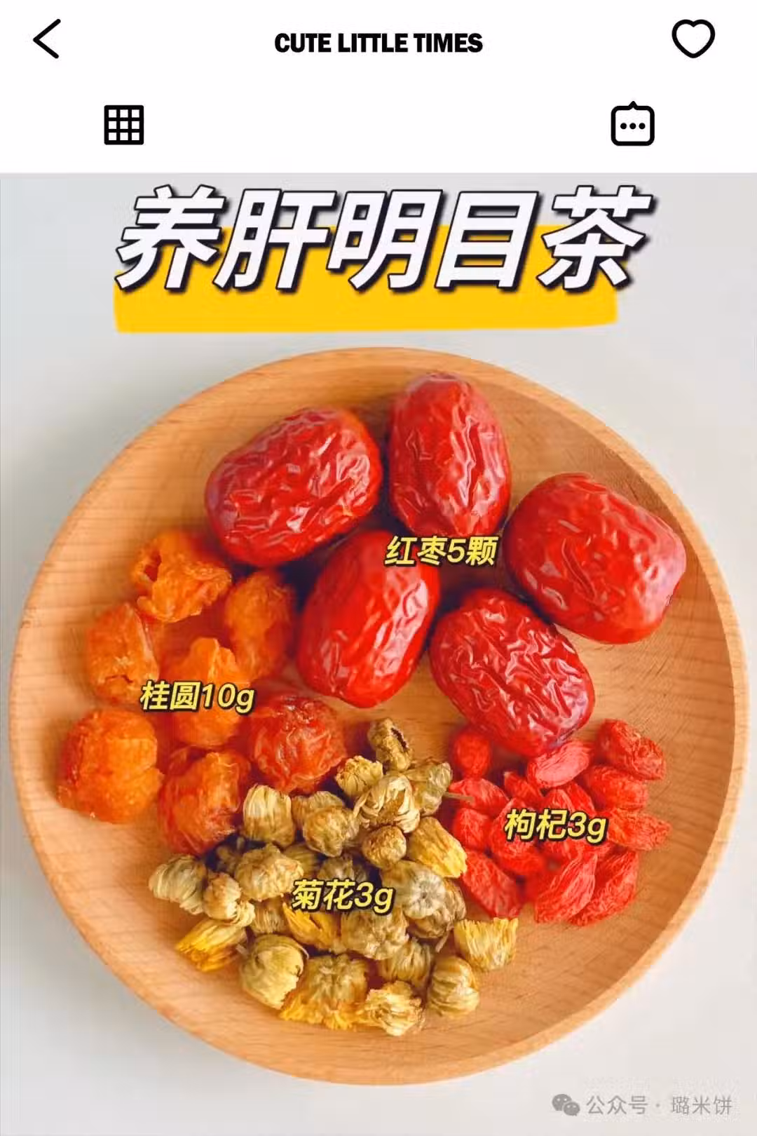 桂圓10g、紅棗去核5顆、枸杞3g、菊花3g