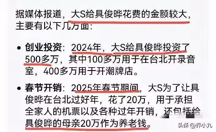 但是大s對具俊曄拿的都是真金白銀,光2024年,大s就給具俊曄投資了500多萬,100萬開音樂工作室,400開潮牌店。