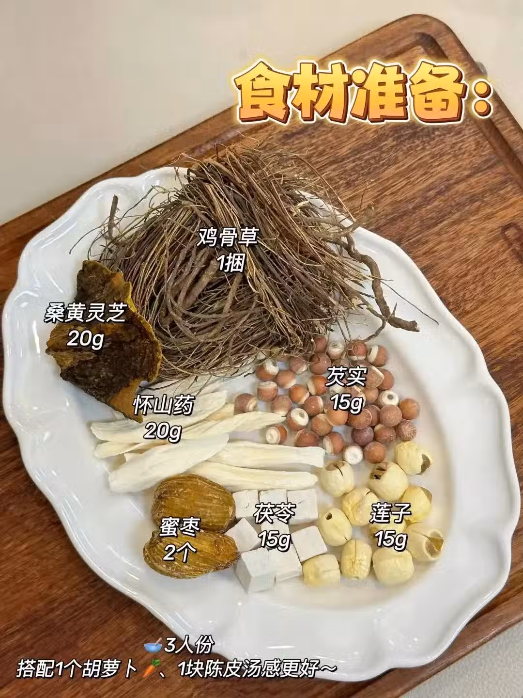 雞骨草、芡實、懷山藥、蓮子稍微沖洗乾淨,胡蘿蔔去皮切塊,陳皮泡軟,蜜棗、薑片洗凈備用。