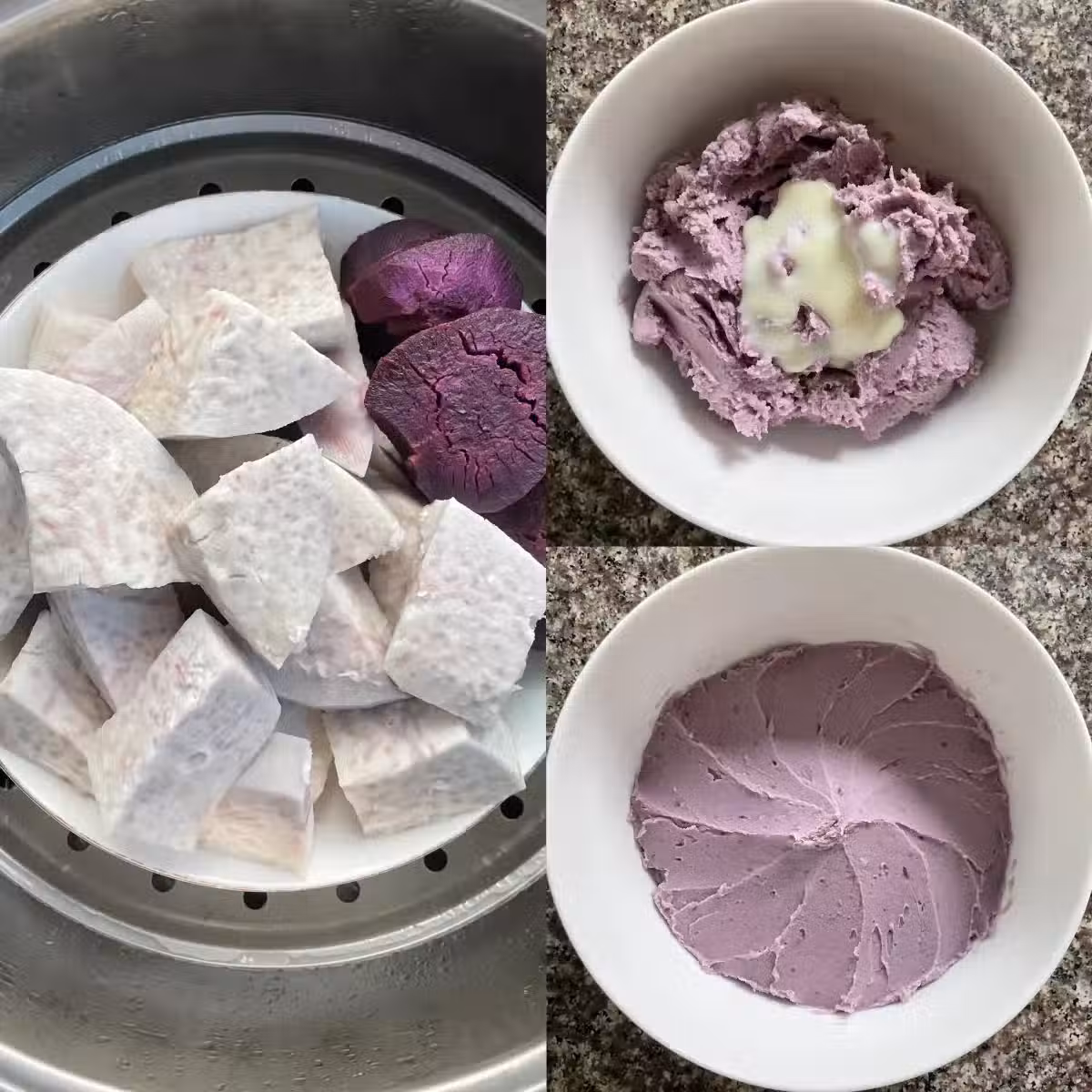 2️⃣深盤鋪油紙,底部均勻鋪滿紅豆。糯米粉加清水攪勻至無顆粒,倒入深盤中。水開後,放入蒸鍋中,中火蒸20分鐘左右,蒸好取出,徹底放涼後脫模。其中一半抹芋泥,從中間對半切開,把沒有芋泥的一半翻蓋上去,最後切塊即可。