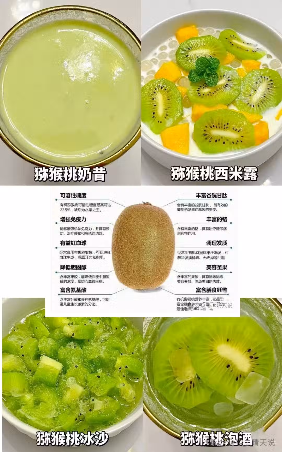 推薦吃法 每天吃 1 - 2 個獼猴桃,直接食用即可。也可將獼猴桃切成小塊,加入酸奶中,製作成美味的獼猴桃酸奶杯。既美味又營養,為肌膚補充所需營養。