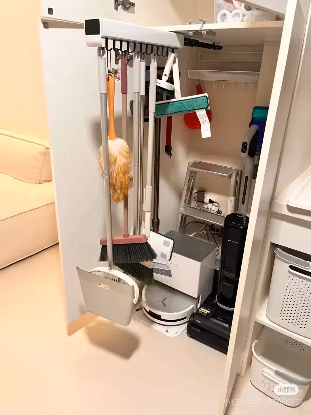 如果沒有提前做家政櫃,用一些收納掛鉤都藏在門後也挺好,整齊擺放,懸空收納,好拿好放的同時,還不製造新的衛生死角。