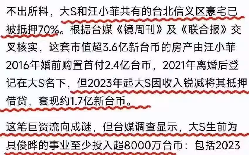 據知情人透露,大S生前資金就很緊張,她再婚後,並沒有參加什麼工作,還為具俊曄花了很多錢,屬於坐吃山空的狀態,還房貸已經很吃力了。