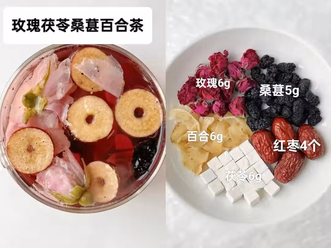 玫瑰的芬芳有助於驅散肝臟中的鬱結之氣,茯苓能排出體內滯留的濕邪,桑葚則滋養肝血,百合具有潤肺止咳的功效。