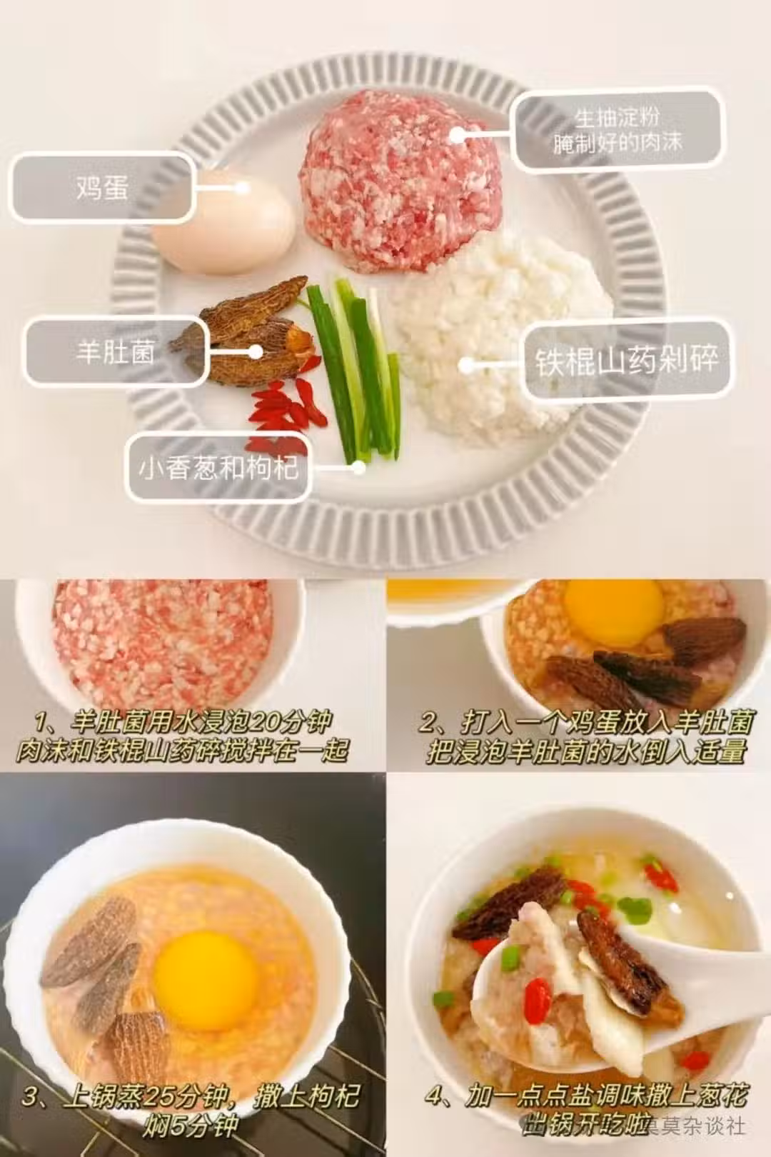 食材: 豬肉末 100g | 羊肚菌 2個 | 鐵棍山藥 適量 | 雞蛋 1個 | 枸杞 適量 | 小香蔥 少許 | 鹽 少許