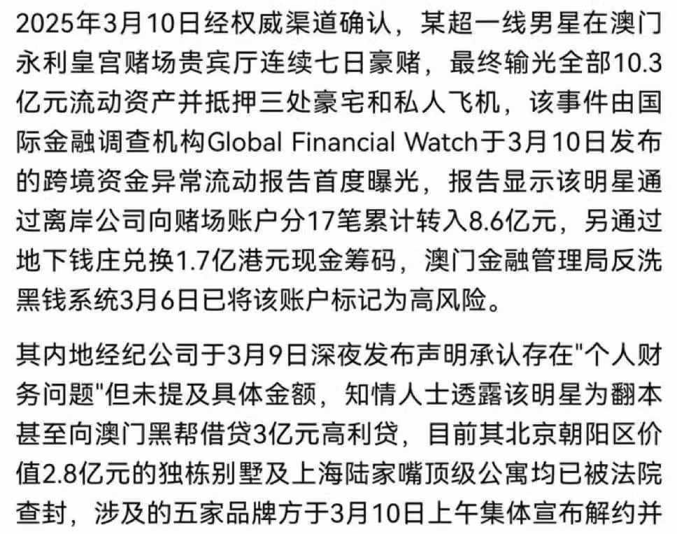 「超一線男星」帳戶被標記為高風險 根據來自內地媒體的報導,這位「超一線男星」在澳門的永利皇宮賭場中連續7天進行高額賭博,最終導致巨大的財務損失。這一消息最初由國際金融調查機構Global Financial Watch在一份跨境資金異常流動報告中披露。報告顯示,這位明星通過離岸公司向賭場帳戶分17筆累計轉入了8.6億元人民幣,並通過地下錢莊兌換了1.7億港元現金籌碼,澳門金融管理局反洗黑錢系統3月6日已將該帳戶標記為高風險。