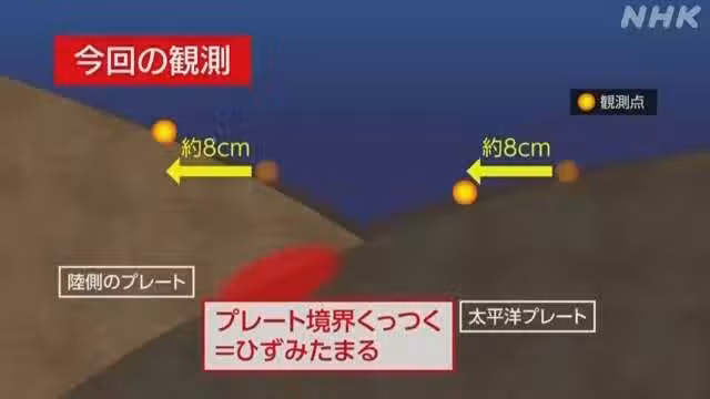 研究團隊直言,海側的板塊每年大約以8公分的速度朝向陸地移動,而設置在陸側板塊、靠近海溝軸的觀測點也同樣每年移動約8公分,代表海側板塊正向下沉入陸側板塊之下,兩者之間緊密黏合,導致能量不斷累積。