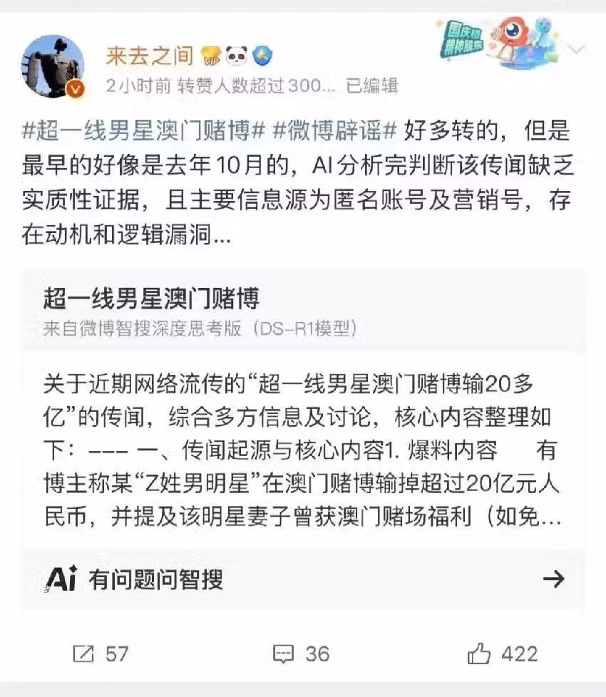 根據這則由AI工具輸出的信息匯總結果,「超一線男星澳門賭博」的傳言可能起源於去年10月的一則營銷號爆料視頻,聲稱「Z姓男明星疑似在澳門輸了20多個億元」,隨後,這一消息在多個網絡平台引發了大量猜測和二次傳播。