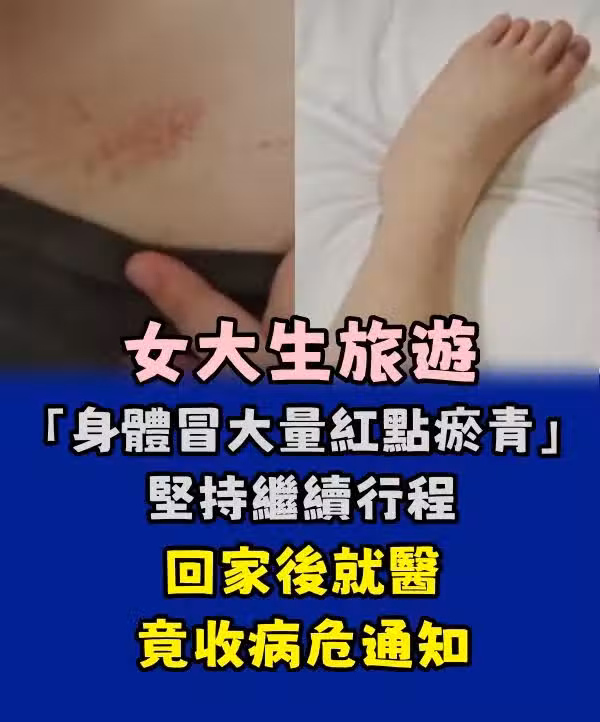一名女大生在旅遊期間,身上莫名冒出許多紅點和瘀青,但因為不痛不癢她便沒在意繼續旅程,豈料回家後她竟進了急診,甚至收到病危通知。