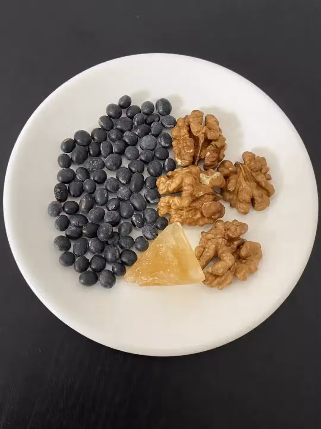 1️⃣黑豆洗乾淨,浸泡過夜。核桃仁掰成小塊。