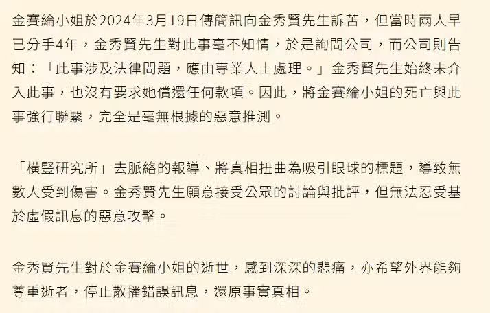 金秀賢方逐一回應私密照、情書、7億債務爭議,強調金賽綸自殺和他無關