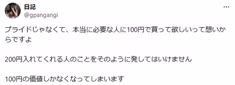 「我雖然也不是特別有什麼錢,但是看到一箱這麼多青花菜,也會覺得只花100日圓很不好意思,所以會掏200日圓吧(汗」