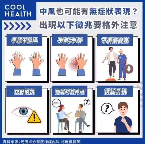 還有一種「小中風」,症狀會持續幾分鐘或幾十分鐘,最多不超過 24小時,不會留下任何後遺症,多數患者患病的時候意識清楚。