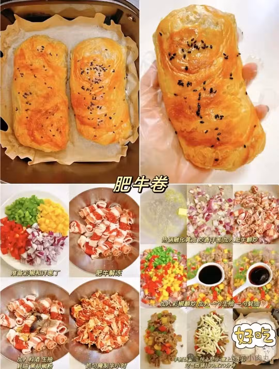 3⃣️空氣炸鍋版酸菜肥牛來襲! 五花肉經簡單腌制,搭配洗好爆乾的酸菜和洋蔥,撒上靈魂調料,放入炸鍋。不一會兒,香味四溢,外焦里嫩,酸辣過癮,一口就淪陷,趕緊做起來!