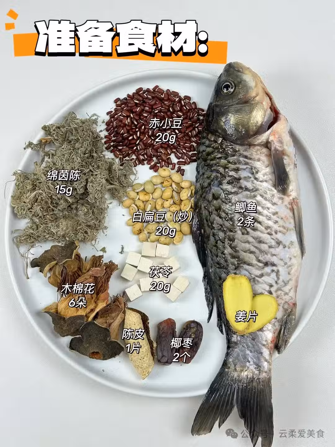 3、除鯽魚所有食材放入鍋里,加入瘦肉和適量清水先煲30min;