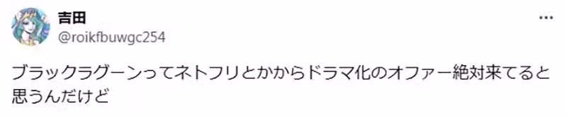 一位暱稱「吉田」的日本X網友,最近發文聊起了《BLACK LAGOON》這部漫畫,明明很有被NETFLIX之類的平台改編成真人影集的潛力,但是為什麼至今都沒有消息呢?