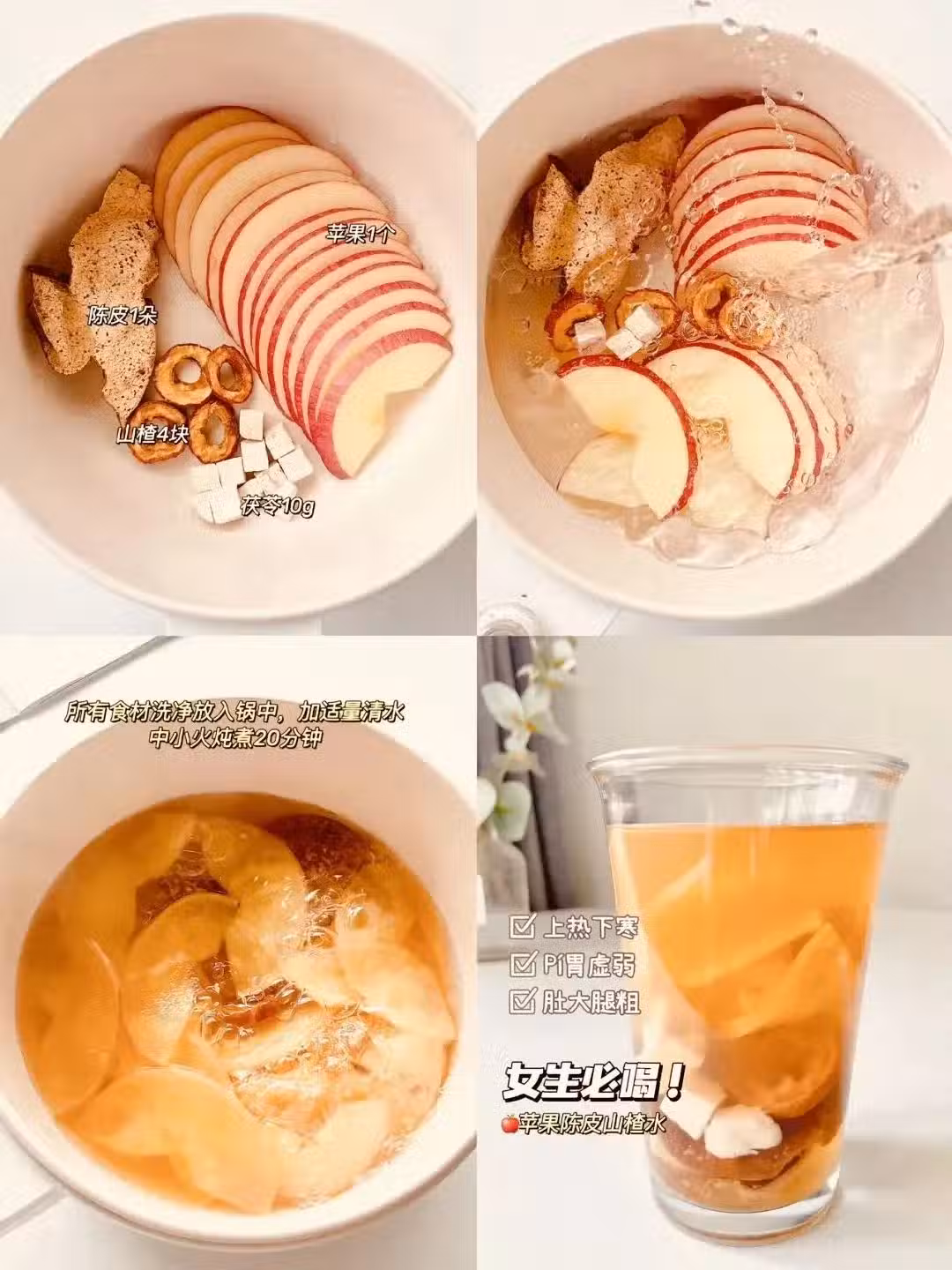 煮制後的蘋果,其膳食纖維得到軟化,更易於消化和吸收。這些食材的組合,能有效潤腸通便,幫助消化,非常適合那些經常感到腹脹和消化不良的姐妹們飲用!快來試試吧!
