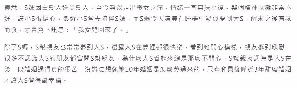 除卻 S 媽,S 幫親友亦時常夢到大 S,透露大 S 在夢中皆甚為快樂。親睹其開心之模樣,親友深感寬慰。諸多不相識大 S 的朋友皆會詢問 S 幫親友,緣何大 S 看上去總是那般鬱鬱寡歡。