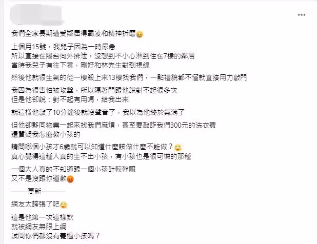 不過貼文一出,引來網友抨擊:「有廁所為什麼不去...六歲至少怎麼走去上廁所吧」、「原來被尿到身體只要說對不起就好喔?」、「你才是所謂的惡鄰居吧」、「還敢詛咒別人家生不出小孩,生了也是很可憐那種,你的心態很非常有問題」、「這沒把你家門拆了都算客氣了吧」、「這種家教,早晚產出有問題的下一代」。