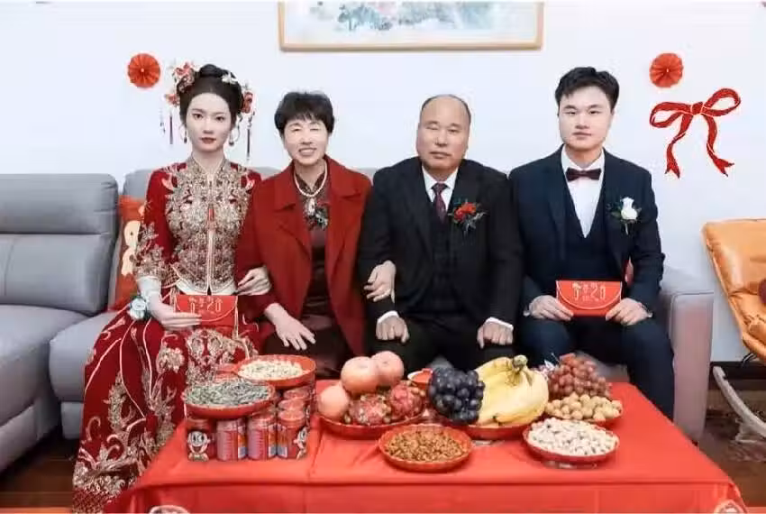 而婆家則相對簡單,只在茶几上擺了些象徵早生貴子的花生,整個布置更加隨意。