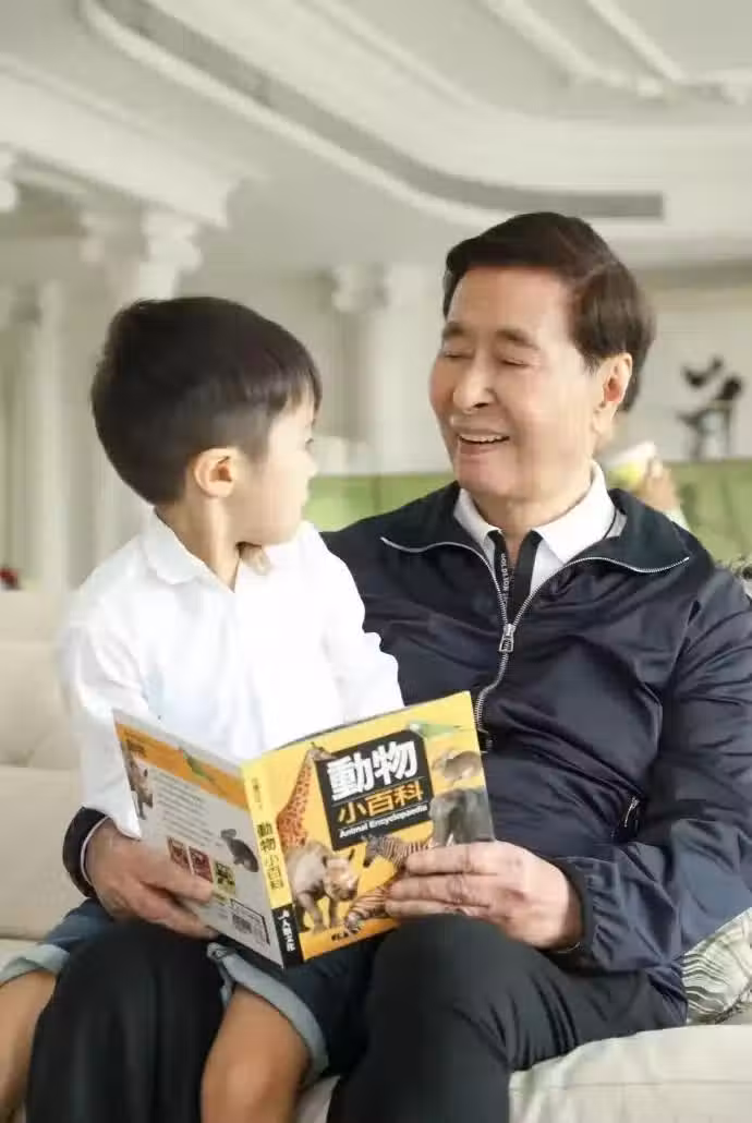 另外還有一張,李兆基抱著自己的小孫子正在看書,是動物小百科,小孫子坐在他腿上,他耐心講解,這張畫面超級有愛,李兆基看向小孫子的眼神充滿了愛。