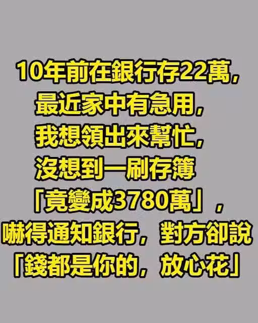 10年前在銀行存22萬,最近家中有急用,我想領出來幫忙,沒想到一刷存簿「竟變成3780萬」,嚇得通知銀行…對方卻說「錢都是你的,放心花」!