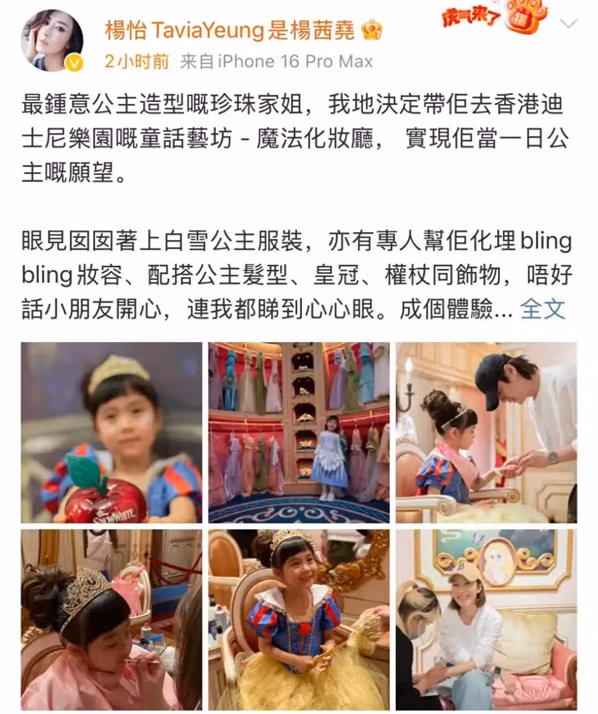 3月20日,楊怡(楊茜堯)在社交平台曬出和老公羅仲謙(羅子溢)帶著4歲的女兒小珍珠去迪士尼實現「當一天公主的願望」。