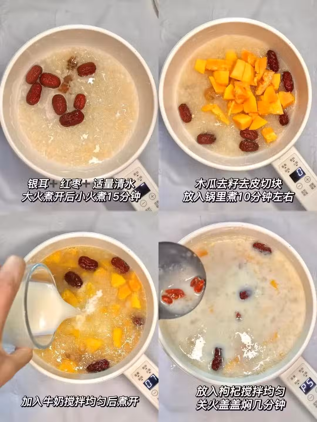 1.先把銀耳泡發,和紅棗一起放進鍋里,加適量清水,大火煮開後轉小火煮15分鐘。