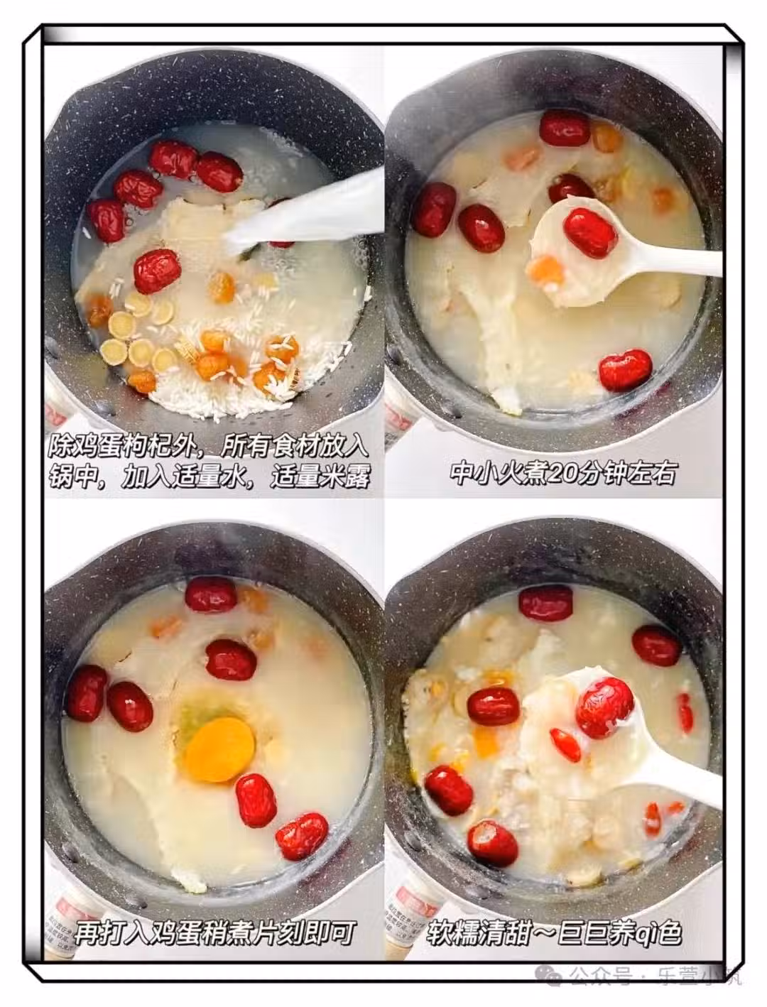 所有食材洗凈,除雞蛋枸杞外所有食材倒入鍋中,加入適量清水和米露中小火煮20分鐘左右,再打入一個雞蛋、再撒入枸杞稍煮片刻即可