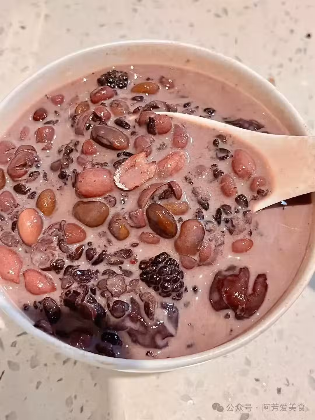 煮至豆粒輕捏即碎時關火,倒200ml冷藏鮮奶快速攪勻