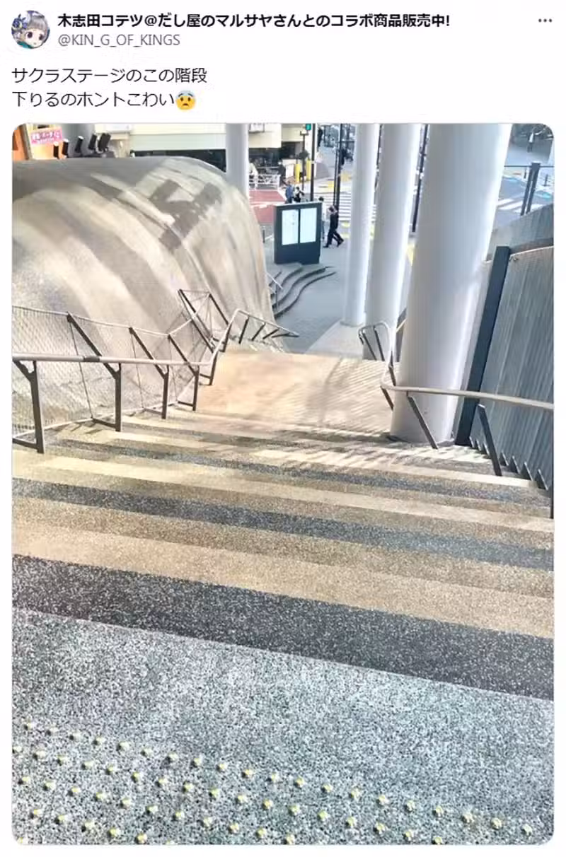「聽說這座返無障礙的樓梯在澀谷Sakura Stage,我就去現場看一看了。的確很像是錯覺藝術,從特定角度真的看不出來落差,似乎很難走。不過肉眼要看也還是看得出來,應該是沒有到會摔倒的地步啦。話雖如此,這個設計相當不體貼倒是真的。」