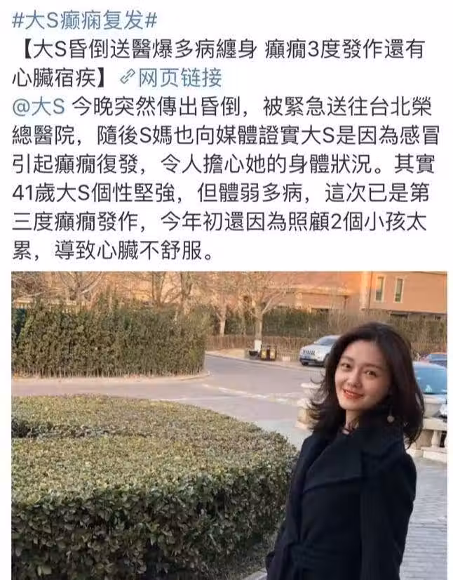 大 S 的癲癇病情較為嚴重,她曾多次因癲癇發作昏迷住院。