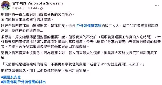事後,臉書粉專「雪羊視界」坦言,與陳男是好朋友,他亦是粉專「戶外裝備研究所」的版主,曾給自己許多寶貴的知識與建議,如今心情感到十分沉重,強調「願吾友安息」、「謝謝你對戶外裝備圈的付出」。