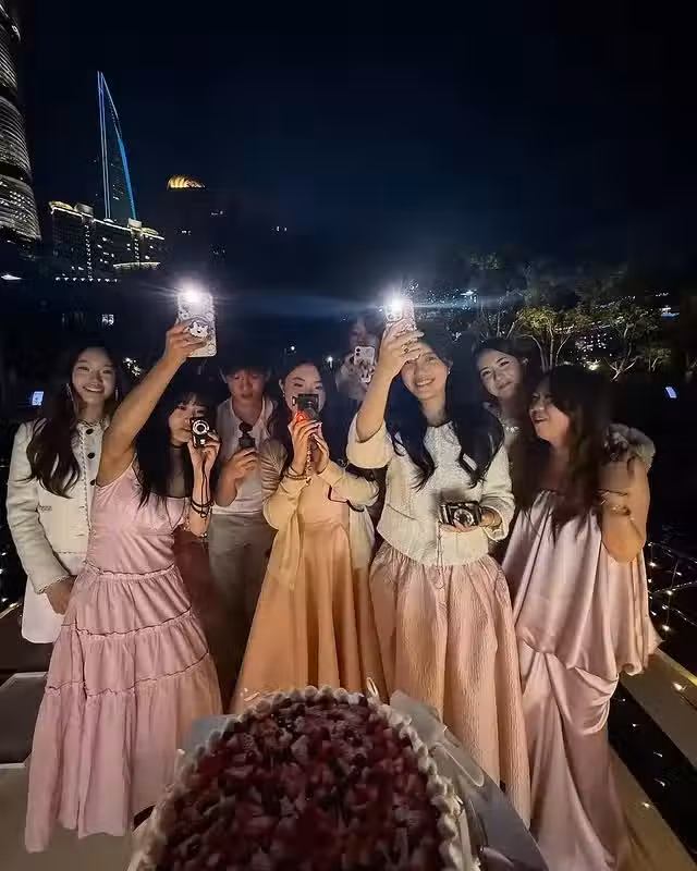 遊艇在江上行駛著,年輕人舉起手機為朋友記錄下特別的生日,話說梧桐妹真的挺會暖場的,和姐妹們一定也是玩得特別開心。