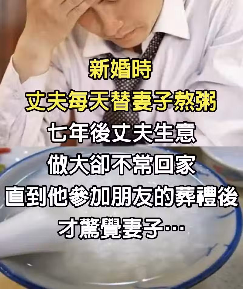 新婚時丈夫每天替妻子熬粥,七年後丈夫生意做大卻不常回家,直到他參加朋友的葬禮後,才驚覺妻子…