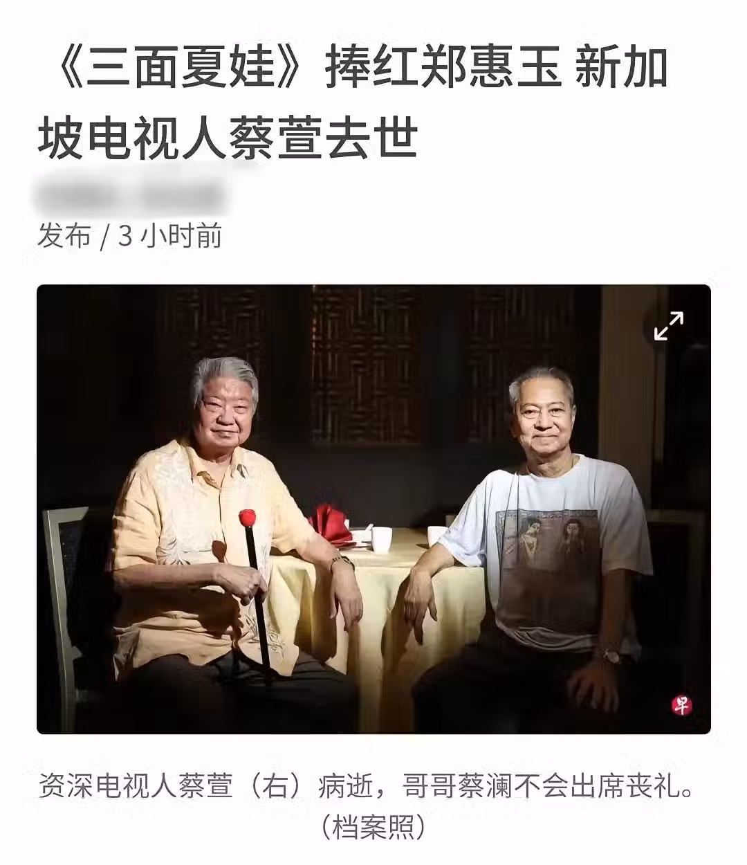 蔡宣的死因也曝光了出來,是病逝。而哥哥蔡瀾將不會出席弟弟的喪禮。原來蔡宣是新加坡知名的電視監製、導演,他年輕的時候曾經拍攝《三面夏娃》、《調色板》而捧紅了鄭惠玉,把她捧紅成當地的一姐,一哥李南星也是蔡宣所捧紅,可以說蔡瀾的弟弟蔡宣也是一位很厲害的人物。