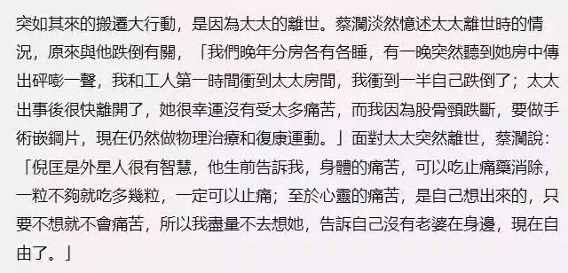 別看蔡瀾一生美女相伴,但是人到晚年另一半先走,他還是非常難過和傷心,尤其是身體抱恙的時候。-----------------