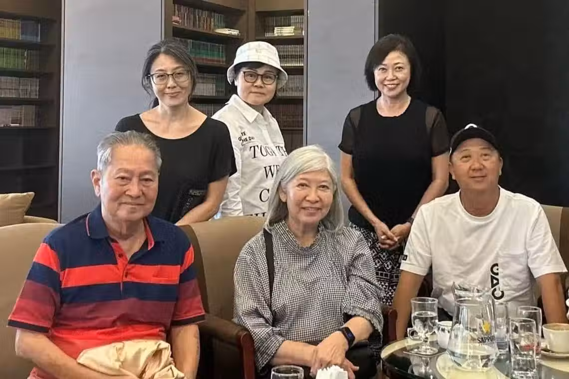 蔡萱(前排左起)、資深藝人李茵珠和前製作人廖明利、蔡萱女兒蔡珊(後排左起)、前監製王尤紅和向雲之前在聚會上合影。(王尤紅提供)