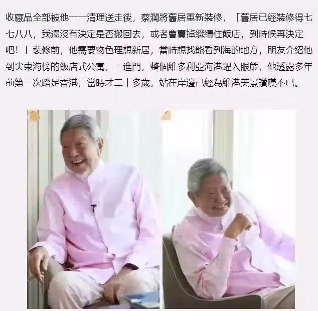 哥哥去世,弟弟也去世,而蔡瀾在去年也自己交代身後事,說自從他的老婆去世後,他已經看淡一切。一生風流無兒無女的他,把財產和收藏品都清理送走,寧願自己去住酒店也不願意住家裡,就是擔心有一天自己離世都沒有人發現。
