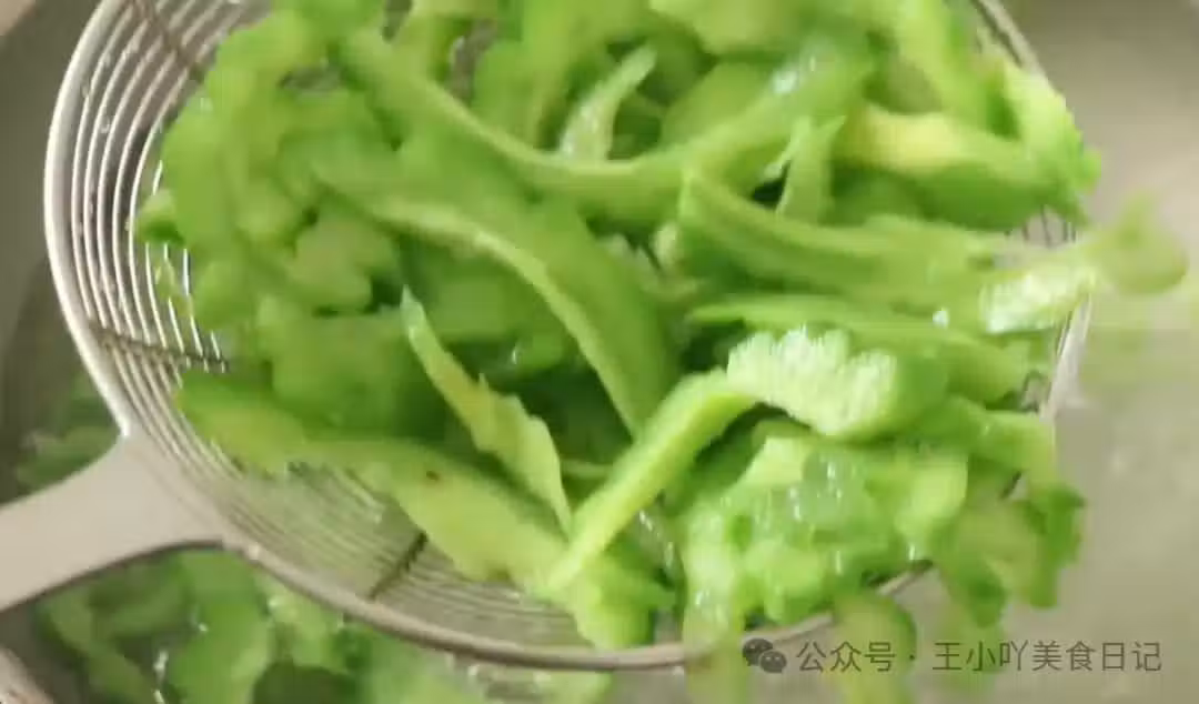 加入鹽和油焯水,可以讓苦瓜保持翠綠不變色。焯水時間不要過長,兩分鐘即可。焯好水後,控水撈出,再過一下冷水(最好是選擇涼白開,更加乾淨衛生)。過冷水可以減少葉綠素的流失,讓苦瓜的口感更加脆嫩。