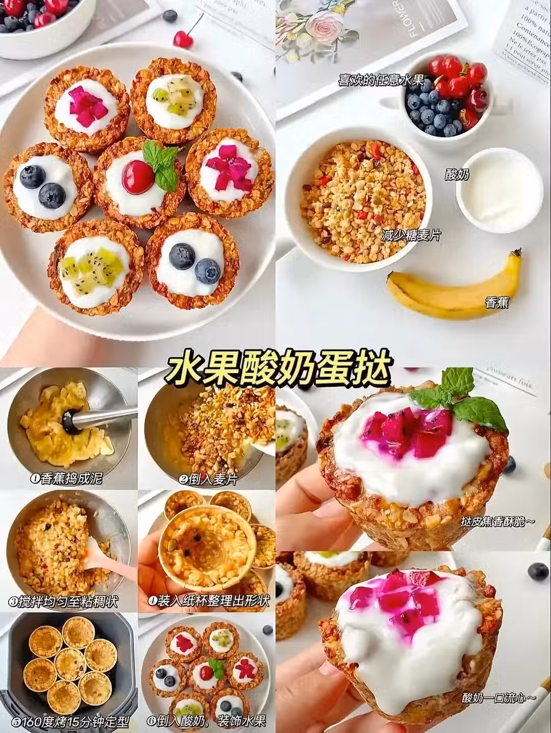 水果酸奶蛋撻:英國貴婦下午茶叛變記,把酸奶+水果+蜂蜜攪成流動奶蓋,烤好的蛋撻皮晾三分鐘,澆上奶蓋再堆滿草莓藍莓,最後撒糖霜拍照。