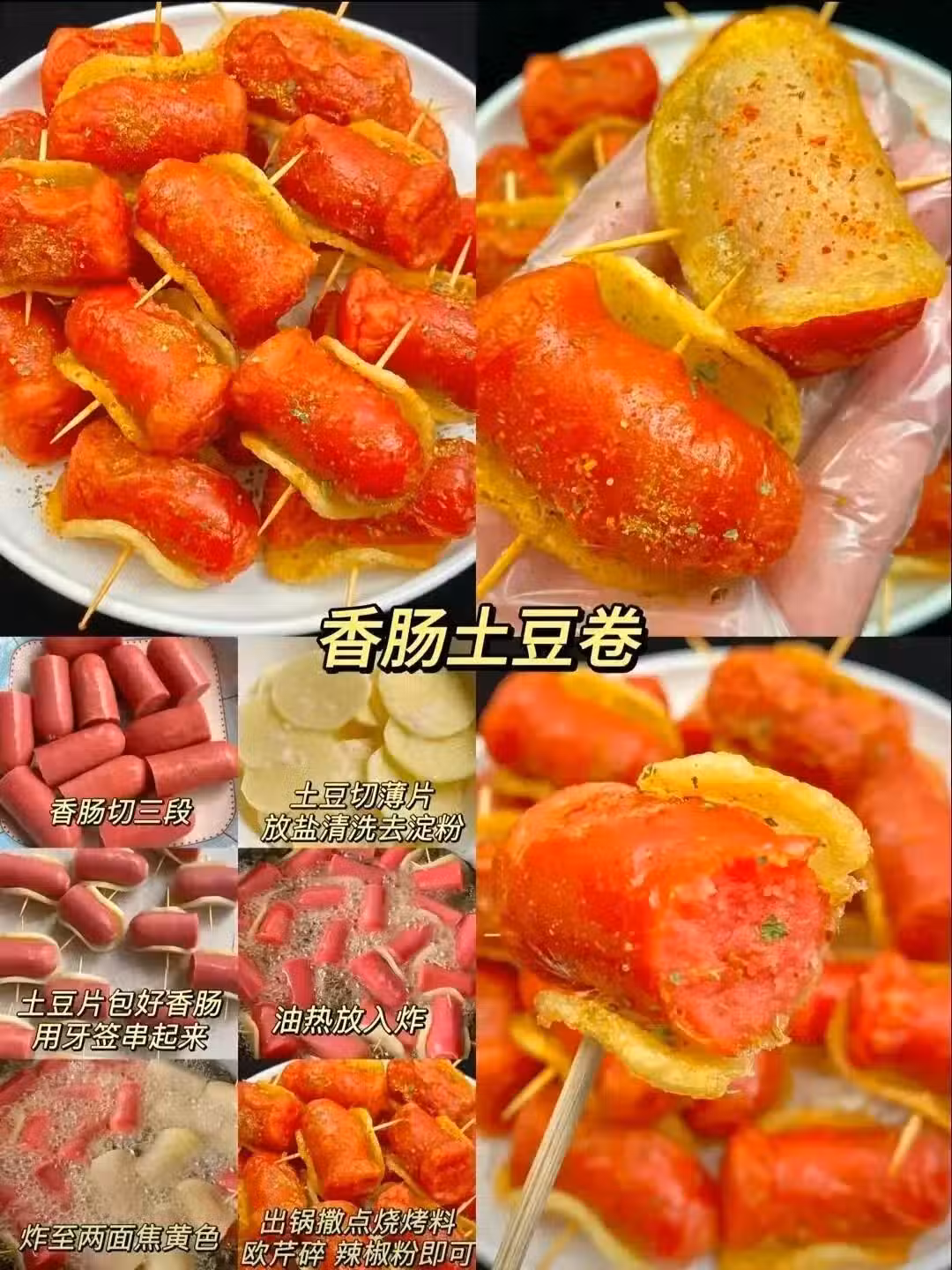 香腸土豆卷:德國香腸的東方奇幻漂流,脆皮腸切花刀,裹上擀成紙薄的土豆片,刷層油送進油鍋。 高溫讓土豆片收縮成鎖子甲,香腸汁在鎧甲里咕嘟冒泡。蘸番茄醬是常規操作,蘸老乾媽才是隱藏劇情。