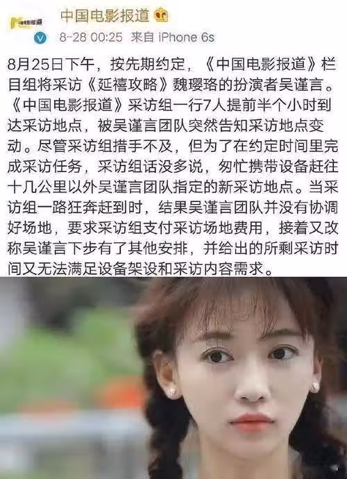央視電影頻道在微博公開批評吳謹言團隊,直指他們工作態度不專業,並且強調藝人品德的重要性。