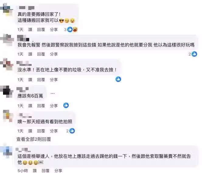 貼文曝光後,瞬間引發熱議,一票人眼睛直發光,大喊「馬上到」、「3500萬個小朋友躺地上? 來哥哥帶你們回家睡,地上冷」、「撿了跑走馬上花光,雙手一攤沒錢,能怎樣?」、「錢多到可以作怪?」、「撿起飛車衝去派出所申報撿到遺失物,坐等領合法酬金」、「真的是要搬磚回家了!這種磚搬回家我可以」、「沒水準!丟在地上像不要的垃圾,又不准我去撿」,也有人懷疑,是否是場騙局,警告「小心別被仙人跳」。