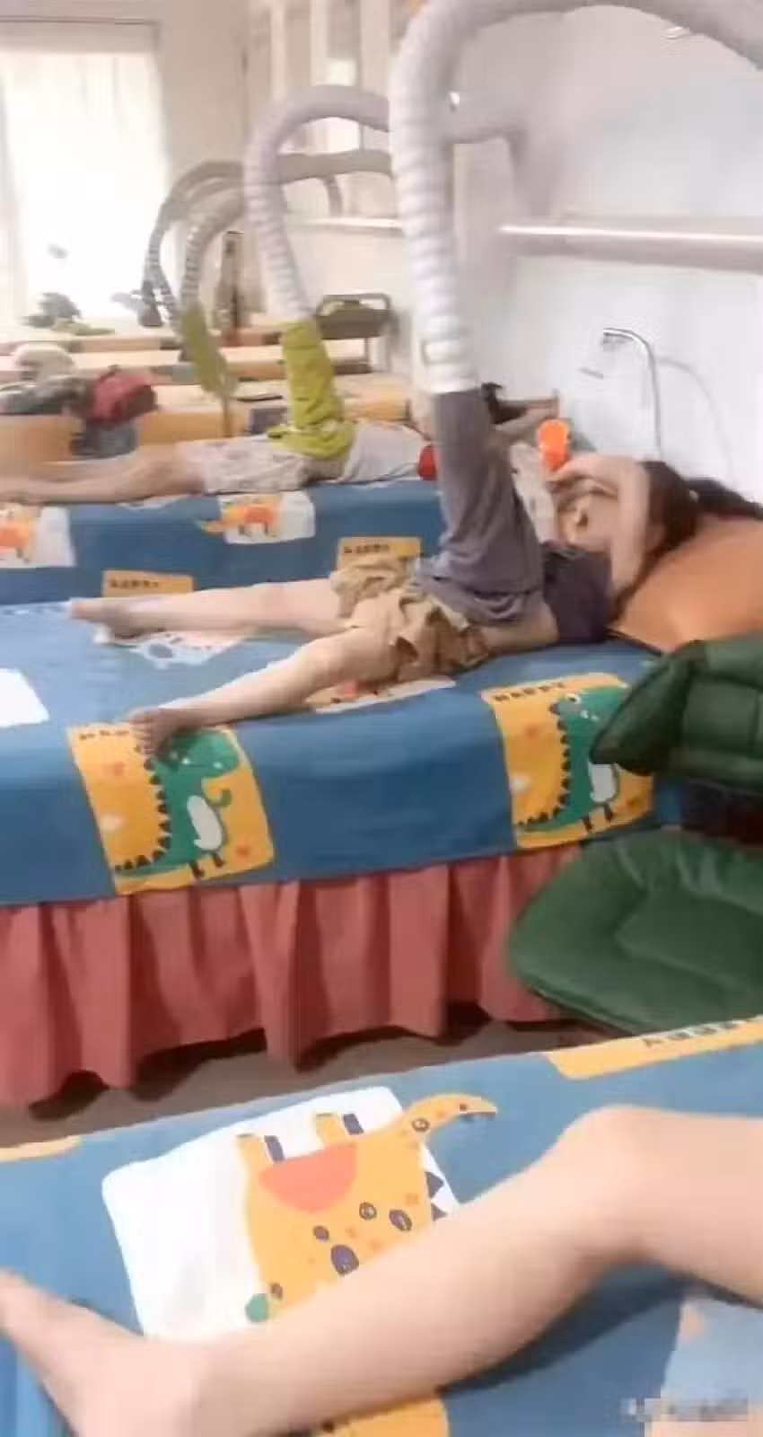孩子們圍坐在一張張小床邊,這些小床上鋪著印有可愛恐龍圖案的床單,顯得格外溫馨。